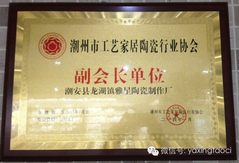 为了将来更好参与陶瓷学术活动、扩大陶瓷知识的交流研讨、提高企业形象及知名度,于2013年8月申请成为潮州市工艺家居陶瓷行业协会的一员。经过多月的严格审核,2014年1月潮州市工艺家居陶瓷行业协会正式批准雅星陶瓷制作厂成为其协会副会长单位。
